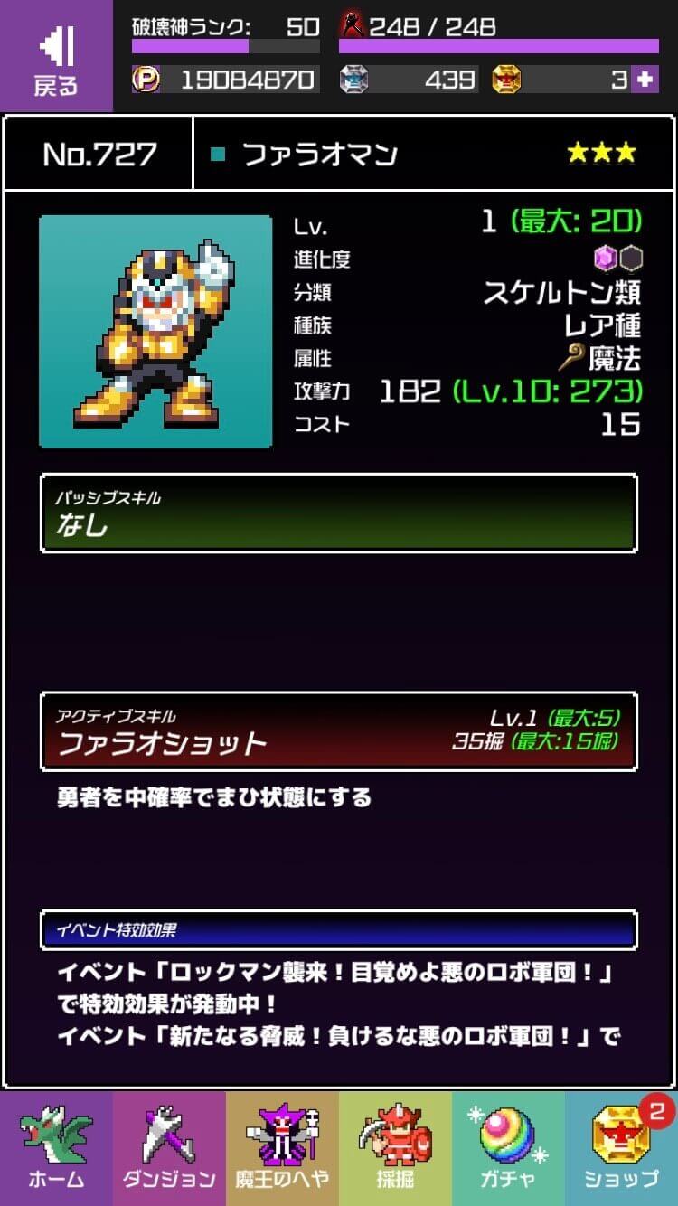 ファラオマン(進化度1)を進化させると、ファラオマン(進化度2)になります。